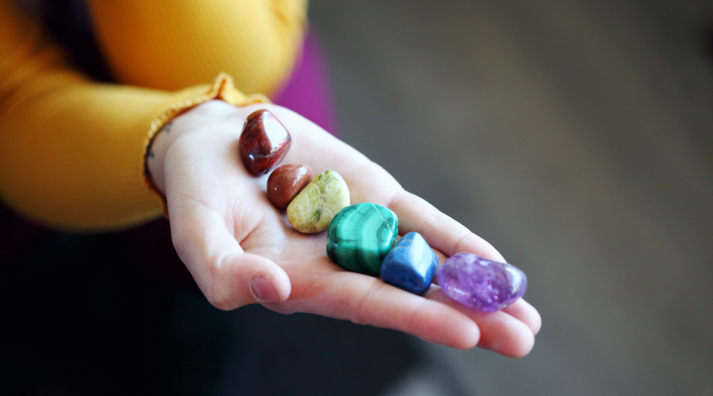 Cristales (por ejemplo, cuarzo rosa para el corazón, amatista para el tercer ojo).